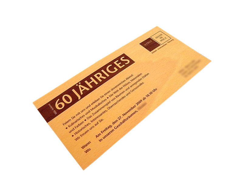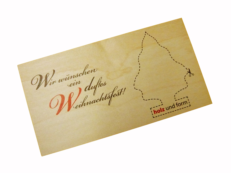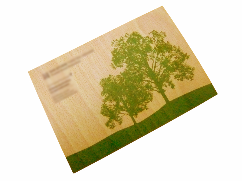 Karte, Postkarte aus Holz Detailansicht Holzfurnier Ahorn, Digitaldruck Postkarte aus Buchenfurnier, Druck 4-farbig